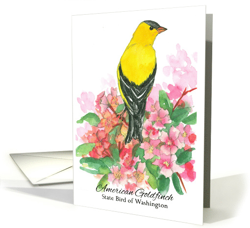 | Artist Notes: | A greeting card featuring the State Bird and State Flower of Washington decorated with a bright yellow American Goldfinch perched on a pink rhododendron flowering bush painted with watercolor. |