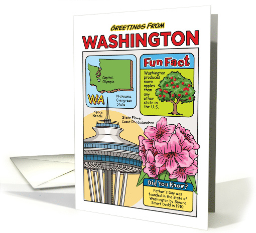 | Artist Notes: | Greetings from Washington landmarks and symbols. Illustrations include the Space Needle, Coast Rhododendron and an apple tree. State capitol is Olympia and nickname is Evergreen State. |