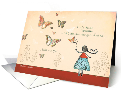 | Artist Notes: | This motivational and encouragement card in German features an illustration of a girl holding a butterfly on a leash. Text translates:don't put a leash on your dreams , let them free, live your dreams= halte deine Träume nicht an der kurzen Leine, lass sie frei, lebe deine Träume |