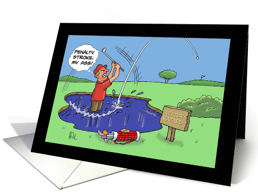 | Artist Notes: | Humorous Blank Note card for a golfer. The cartoon shows a golfer standing in a water hazard. He has forcefully hit the ball out of the water. He is thinking, Penalty Stroke My ***! Inside is blank |