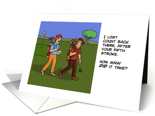 | Artist Notes: | Humorous Blank card with a cartoon showing two golfers, one asking the other: I lost count back there, after your fifth stroke. How many did it take you? |