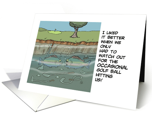 | Artist Notes: | Humorous Golf themed Blank card with a cartoon showing two fish in a lake on a golf course. The lake is filled with golf clubs that have been thrown in. The words say: I liked it better when we only had to watch out for the occasional golf ball hitting us! |