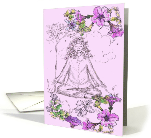 | Artist Notes: | A peaceful blank card with a yoga theme with a woman in lotus pose sitting by a tree bordered with purple petunia flowers on a lavender background. |