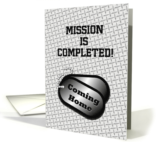 | Artist Notes: | Announcement for Coming Home from The Service. Coming Home Dog Tags-Mission Complete Card with a Metal "Look" Background. |