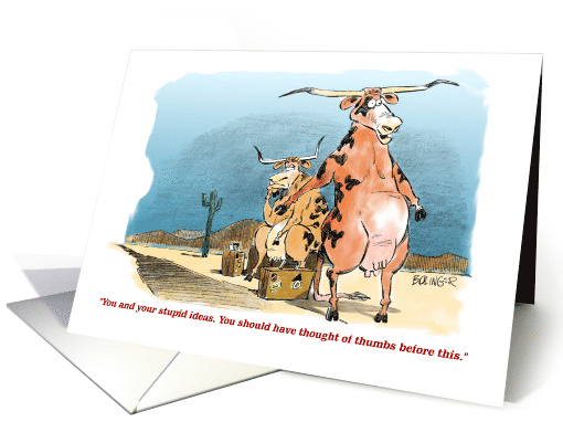 | Artist Notes: | The desert scene cartoon shows two cows, patiently awaiting roadside, trying to thumb a ride home. I was taught to not pick up hitchhikers but I know I'd stop to pick up these two, especially at the price of beef lately. |