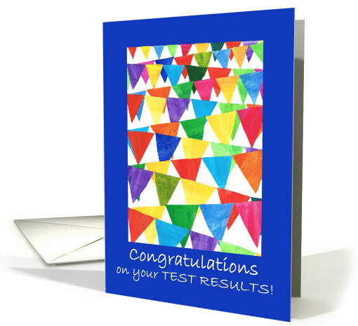 | Artist Notes: | A colourful Test Results Congratulations Greeting Card, with multicoloured flags on a white background, surrounded by a royal blue border, from a handpainted paper collage by Judy Adamson. |
