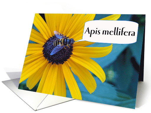 | Artist Notes: | Apis mellifera, scientific name for the honey bee. Congratulations card for a spelling bee winner. Image of a honey bee on a bright yellow flower (brown-eyed Susan). Customize the interior message as you wish. |