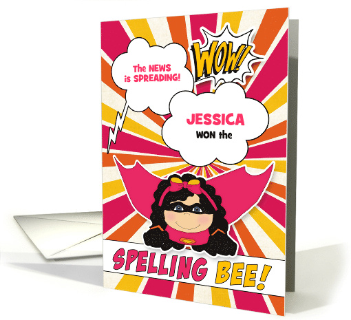 | Artist Notes: | Congratulate your little girl who is a super speller and won the spelling bee with this fun and girly hot pink superhero themed greeting with comic bubbles. |
