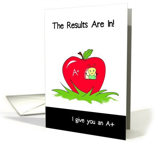 | Artist Notes: | A congratulations on getting straight As card with a drawing of a cute little bug in a bright red apple with an A+. Front reads: The Results Are In! I give you an A+. Image by: Photography TK Designs |