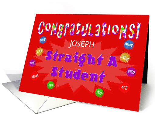 | Artist Notes: | Wow, straight A student. Let them know how proud you are of their accomplishment with this amusing card featuring white congratulatins lettering with splats of colorful paint. The bright red background with an embedded star has paint spots with words of praise including neat, ace, superb, awesome, brilliant and more. Add the student’s personal name to make them a stand out. |