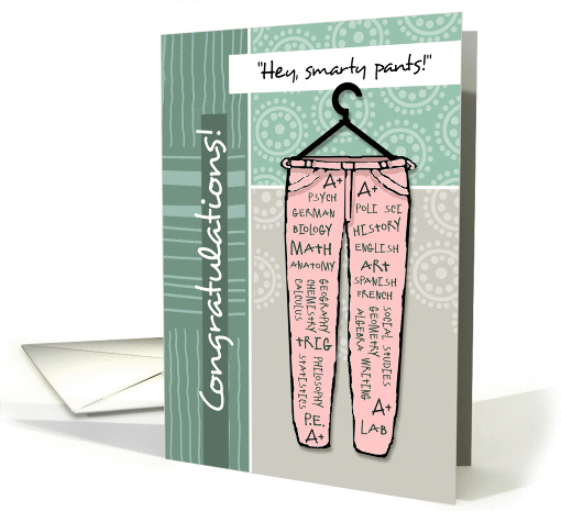 | Artist Notes: | Getting straight A's isn't easy! A lot of studying and hard work go into a 4.00 GPA. Send a congratulations to your favorite "smarty pants"! Design features a pair of pants on a hanger, different school subjects written on the pants, with background flower wheels and hand drawn stripes to give a layered look to the card, and colors are greens and grays. Fun, original design by S. Fernleaf. |