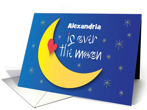 What an adorable way to congratulate a child or someone very special for something outstanding that they have accomplished: an award, a special recognition, a job promotion or outstanding grades in school. The whimsical white hand lettering on the card says "Is over the Moon" with an area above the words to type in the name of who is over the moon with pride for their accomplishment. Perfect for a child, the large crescent moon on the dark blue card is a yellow-orange, with a dark pink heart overlapping it. Tiny yellow twinkling stars fill the sky around the moon. In the area above the wording is the area where you type in the name of the recipient, as you order their card to give them a keepsake they will treasure for their accomplishment. The card's inside wording says "So proud of you! Congratulations!" There is extra space on the card's inside for you to add details about the award they have won, honor attained or accomplishment, while ordering their card.
