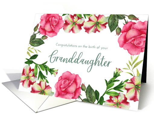 | Artist Notes: | This lovely greeting card features a stunning oval wreath floral arrangement of delicate summer flowers, including pink and white petunias and pink roses, all based on my original watercolor illustration. Send a touch of beauty and warmth to your loved ones with this charming card. The card design is for Congratulations on Becoming Grandparents to a Granddaughter. |