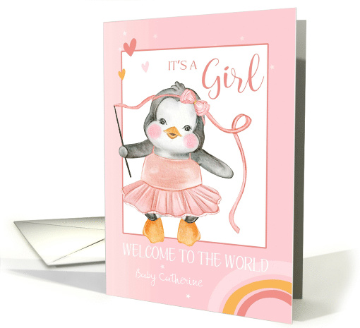| Artist Notes: | It's a Girl, "Welcome to the World" congratulations card to grandparents on the birth of their granddaughter has an adorable vintage penguin twirling a ribbon. Customize with the new little girl's name. |