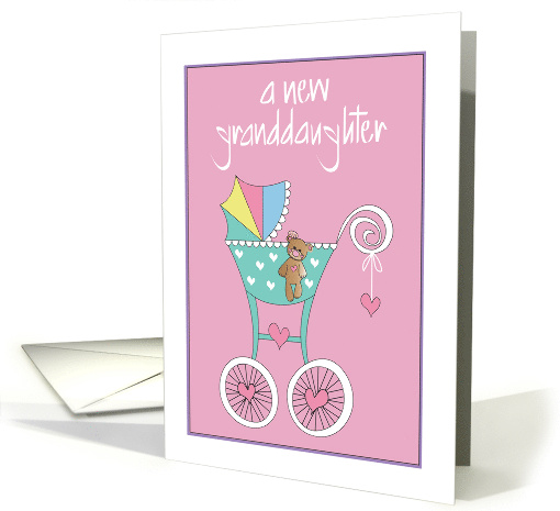 "A New Granddaughter" is the modern script white hand lettered wording, at the top of this pink new granddaughter congratulations card for a couple who are becoming grandparents to a new little baby granddaughter, with a thick white border. The card's stroller, with a folding top of rainbow colors and a side of polka dot teal hearts has a brown teddy bear dangling over the side. Pink hearts decorate the huge white spoke wheels and one hangs from the stroller pusher. The inside wording of the card says "So excited to hear about the arrival of your new little granddaughter! Congratulations!"
