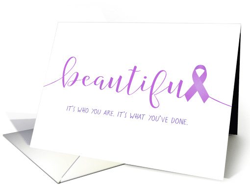 Congratulate someone in their victory over cancer with this calligraphy style typography design that features a lavender cancer awareness ribbon (symbolizing all cancers) as the "L" in the word, "Beautiful." Subhead reads, "It's who you are. It's what you've done." Inside can be customized with your own message.