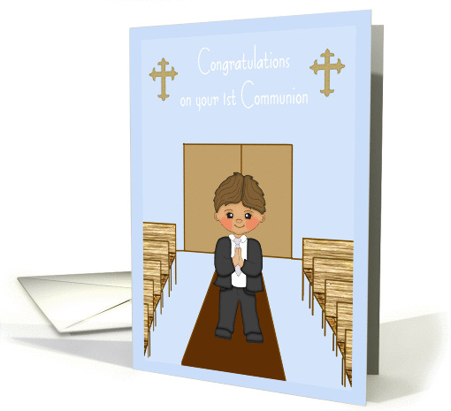 | Artist Notes: | A cute First Communion card that features a blue background with a boy walking down the aisle of a church, his hands folded.. Design ©2013 Kreative Sentiments Cards by Sherry Harris |