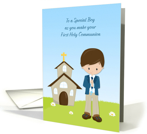 | Artist Notes: | Offer congratulations to a little boy making his First Holy Communion. The card features a boy with brown hair holding blue rosary beads. Behind him is a church, green grass and white daisies and a blue sky. Graphics: Prettygrafikdesign |