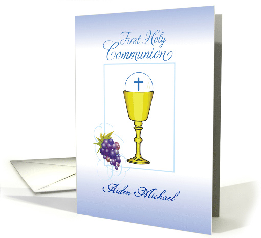 | Artist Notes: | Chalice with host, and grapes fill the front of the card, on a blue and white gradient. With this important step in a young boy's faith life, this personalized blue Communion card will be a wonderful keepsake. |
