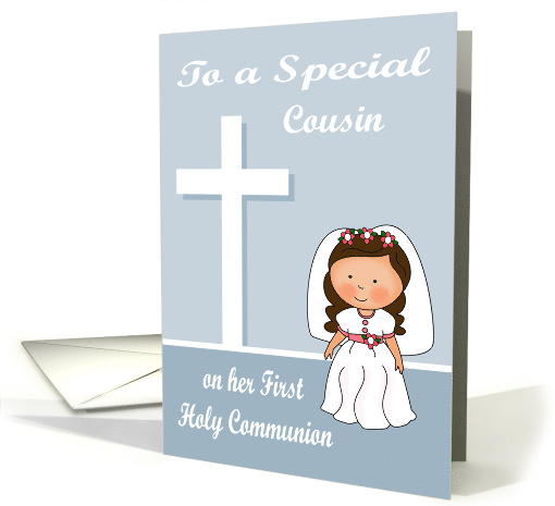 Congratulate your cousin on her First Holy Communion with an adorable, dark hair girl dressed in a white gown with a flower veil, pink buttons, and a pink belt. The background is blue with a white cross with light blue shading and white text. FYI: According to the Roman Catholic Church, the Eucharist is the true presence of Jesus Christ, the Son of God. During a Mass, through the act of transubstantiation, the bread and wine offered change, and are no longer bread and wine. They become the Body and Blood of Jesus Christ