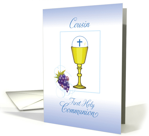 | Title: | Cousin First Communion Chalice with Host and Grapes on Blue |