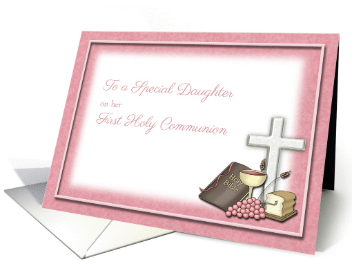 | Artist Notes: | A First Holy Communion congratulations card for a special Daughter with traditional Communion bread, grapes, chalice, bible and white cross framed in pink with soft edges. Artwork from Digi Web Studio. |