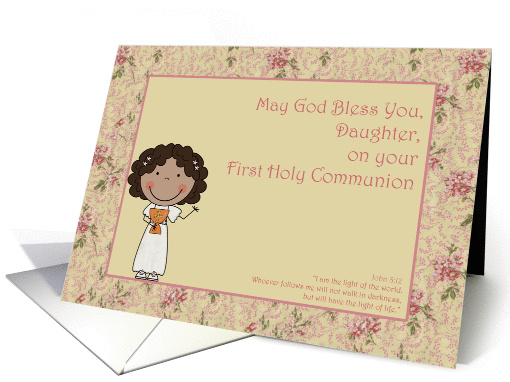| Artist Notes: | Congratulate a special Daughter on her First Holy Communion with this greeting featuring cute dark-skinned stick figure girl holding Communion chalice and soft pink and tan floral border. Communion related bible verse included on card front. |
