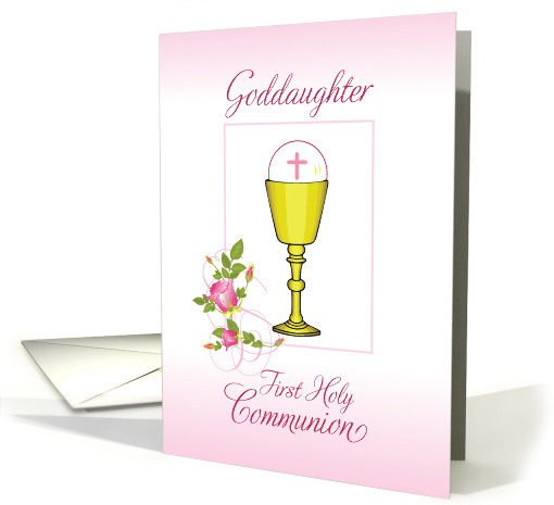 | Artist Notes: | God bless your Goddaguther on this Christian occasion and always. Jesus comes to her on her First Holy Communion. Let her know you are happy for her with this wonderful Congratulations card. Pink roses with green leaves next to a gold chalice with a host inside. |