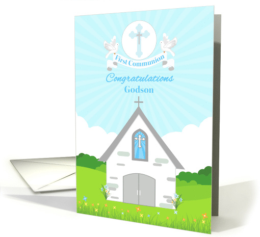 | Artist Notes: | Congratulate a special Godson on his First Holy Communion. This greeting features a peaceful outdoor scene with rolling green hills, clouds and blue sky. In the forefront is a quaint church. At the top are two white doves holding a banner that reads "First Communion" and a symbol of the Eucharist with a blue cross. (Some graphics ©Graphics AMBillustrations) |