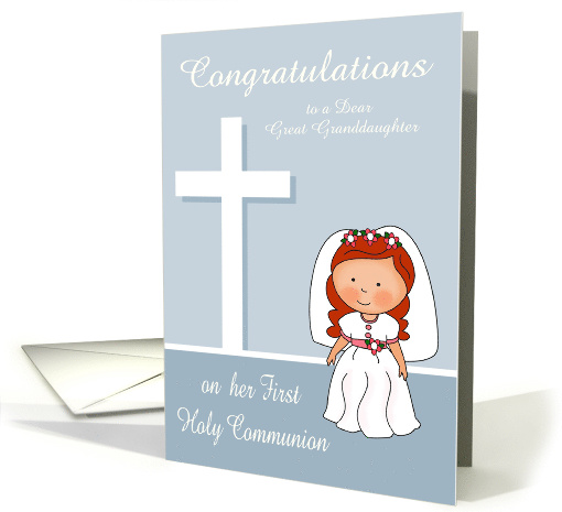 Congratulate any girl in general on her First Holy Communion with a custom name card featuring an adorable red-haired girl dressed in a white gown with a flower veil, pink buttons, and a pink belt. The background is blue with a white cross with light blue shading and white text. The front has a text box for the relationship of the recipient or whatever you choose. The Eucharist, also called holy communion, the sacrament, or the Lord's supper, is a kind of religious ritual in many Christian churches. It started when Jesus Christ told his followers to eat bread and drink wine in memory of him, at the Last Supper. Original design by Laurie Schneider, elements by Jackie Royal Mitchell