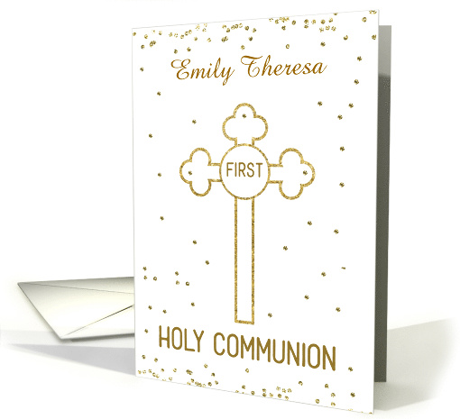 | Inside: | May our Lord watch over you and keep you close to His heart. Each time you receive Communion, may you grow in His love, peace and joy. Congratulations on your FIRST HOLY COMMUNION |