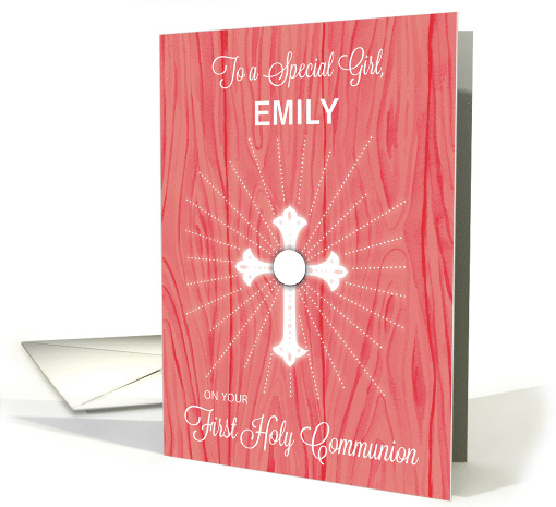 | Title: | Girl Customizable Name First Communion Cross and Rays on Pink Wood |