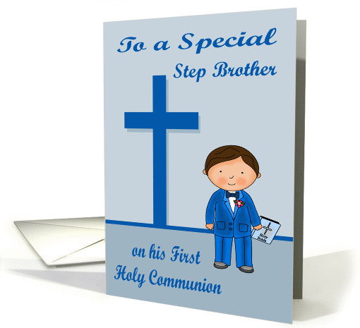 | Artist Notes: | Congratulate your step brother on his First Holy Communion with an adorable brown haired boy dressed in a blue suit with a bow tie and cute, pink flower on his lapel holding a Holy Bible. Background is blue with a dark blue cross and text. Inside like all GCU cards can be personalized by you if you wish to give it your own personal touch. |