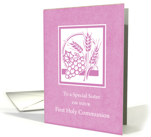 | Artist Notes: | A wonderful christian design in dark pink and white colors for your sister. A big host is seen behind grapes and wheat. On this memorable day, she will appreciate your thoughtfulness as you celebrate with her. |