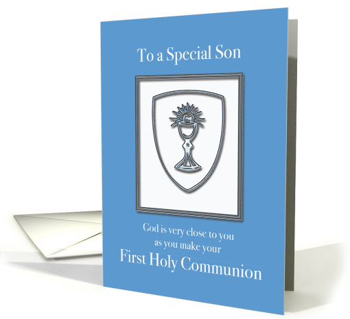 | Artist Notes: | Now that your son is ready to receive his first communion this card will be meaningful from you, his parents. Blue background showcases a silver looking chalice with a host. The silver is digitally created. |