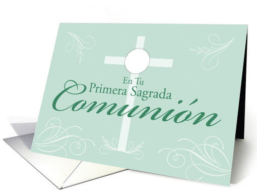| Artist Notes: | This green First Holy Communion card in Spanish is perfect for anyone making their First Communion, whether adult or child. Celebrate with them on this special day by sending them this beautiful Spanish language card! Inside the card is translated: Praying that Our Lord will bless you and renew God’s life within you. Congratulations on your First Holy Communion |