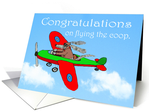 A shaggy grey dog is piloting an open green and red aeroplane. He is wearing a flying helmet and jacket.There are white clouds in a blue sky. ."Congratulations,on flying the coop!"," is written in white.