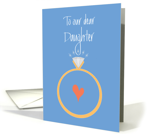 You are very excited about your Daughter's engagement and upcoming marriage. She will love this beautiful congratulations card from you with its hand lettered wording of "To our dear Daughter", that is elegantly hand lettered at the very top of this blue engagement congratulations card. Below, a round golden-colored diamond ring fills the card, with a glistening diamond set atop it and a heart of love filling the inside of it. Your inside wording to her says "Congratulations on your engagement, our very beautiful Bride-to-Be."