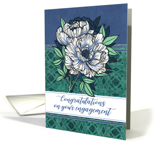 This card features beautiful white peonies hand drawn with chalk pastels, against a blue and green background with linen texture, stripes and an overlapping linen textured circles pattern. Cover text reads: "Congratulations on your engagement" and inside verse reads: "May the upcoming joining of your hearts and lives be just the beginning of a beautiful and lifelong journey together. Wishing you every blessing as you prepare for your wedding!" Perfect for a happy couple on the occasion of their engagement.