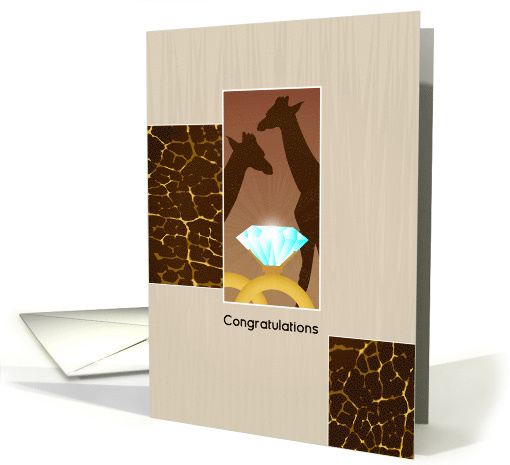 Illustrated Congratulations on your engagement card. Two silhouetted giraffes at sunset with a giant faceted sparkling illustrated diamond ring. Giraffe animal print blocks with grass styling background.Outside text reads: Congratulations.Inside text: You're wildly brilliant together. Congratulations on your engagement.