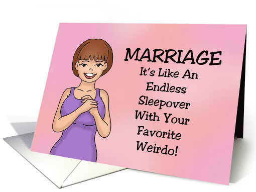 Humorous Congratulations on your engagement card with a cartoon woman on a pink background. The words say: Marriage. It's like an endless sleepover with your favorite weirdo! Inside says: Congratulations on your engagement!