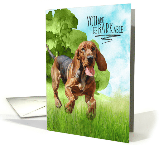 A cute running bloodhound dog lopes through the tall grasses of a summer field enjoying his playtime on this dog lover illustrated card to congratulate someone who is simply reBARKable!