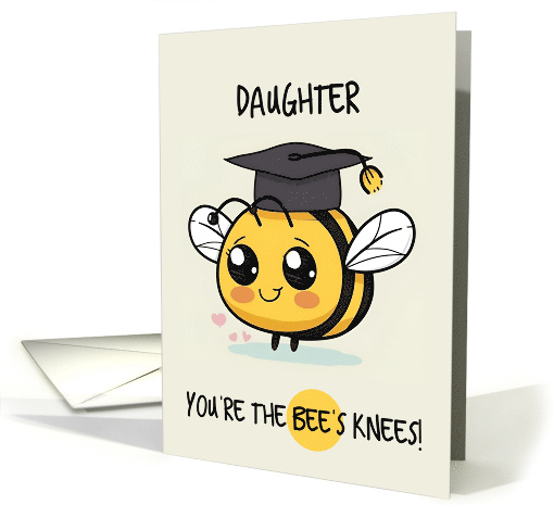 | Artist Notes: | A cute cartoon bee wearing a graduation cap with tassle - in a clean kawaii style with bold black outlines - on a beige background and the text "daughter you're the bee's knees!" A fun card to send to your newly graduated daughter |