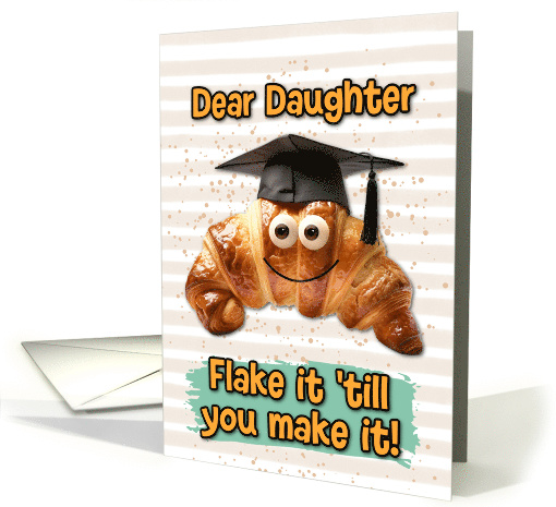 | Artist Notes: | A proud graduate croissant wearing a mortarboard on its head with a tassle on a beige striped watercolor background with splatter effect and the text "dear daughter flake it 'till you make it!' A fun pun card to send to that newly graduated daughter |