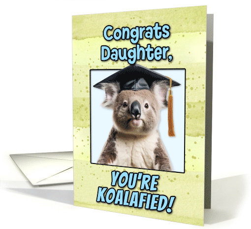 | Artist Notes: | A proud graduate koala bear wearing a mortarboard on its head with a tassle on a green watercolor background with a splatter effect and the text "congrats daughter, you're koalafied!" in light blue. A fun pun card to send to that newly graduated daughter |