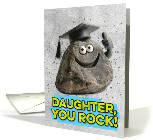 | Artist Notes: | A proud graduate rock wearing a mortarboard on its head with a tassle and giving you the thumbs up on a gray watercolor background with splatter effect and the text "daughter, you rock!' in a lime-green distressed font. A fun pun card to send to that newly graduated daughter |