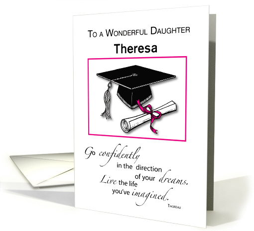 | Artist Notes: | When you are proud of your daughter on her graduation, this card will be perfect to send. A pink and black card with a cap and diploma illustration is showcased with a pink border. The inspiration quote from Thoreau is perfect to congratulate her. Personalize the card with her name for a keepsake card as she graduates. |