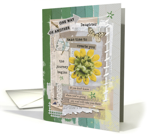 | Artist Notes: | Give fun mixed media effect graduation congratulations to your daughter with this colorful and multi-textured design featuring a bright yellow flower, map pieces,torn paper,white stitches, and a yellow paint splash. ALL ELEMENTS OF THE DESIGN ARE DIGITALLY CREATED. NO ELEMENTS ARE 3 DIMENSIONAL ELEMENTS. DESIGN FEATURES AN INTENTIONAL GRUNGE DISTRESSED TEXTURE AND SHOULD NOT BE MISTAKEN AS A PRINTING DEFECT. |