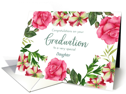 | Artist Notes: | This lovely greeting card features a stunning oval wreath floral arrangement of delicate summer flowers, including pink and white petunias and pink roses, all based on my original watercolor illustration. Send a touch of beauty and warmth to your loved ones with this charming card. The card design is for Daughter on Graduation and can be customized for any relation. |