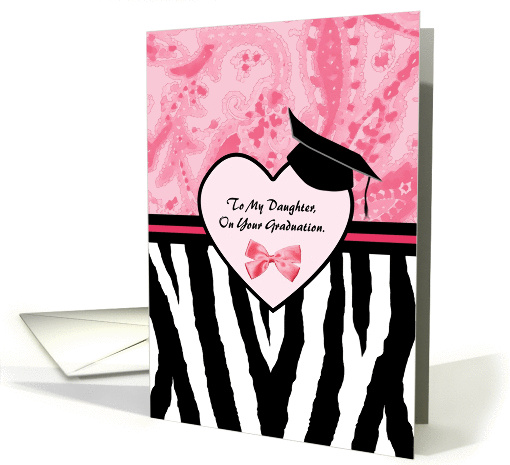 | Artist Notes: | A girly graduation congratulations card for your daughter with a cute pink and black background of a trendy zebra print on the bottom and a pink paisley style floral pattern on the top. Written in the center of a heart with a graduation cap is: To my daughter on your graduation. |